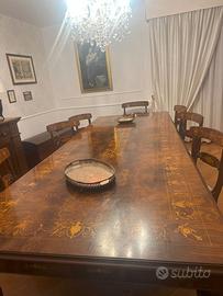 Stupendo tavolo intarsiato a mano apribile con vite senza fine da 8+ 2 posti ampi che anche con l’aggiunta continua il disegno di intarsio senza interruzione. Il tavolo nasconde sotto i 4 piedi a cipolla le 4 rotelle metalliche utili al supporto dell’apertura con manovella in ferro stile inglese. Completa il tavolo 6 sedie con rete pagliata e cuscino seduta damascato e 2 poltrone capitavola. Posizione del tavolo Bologna