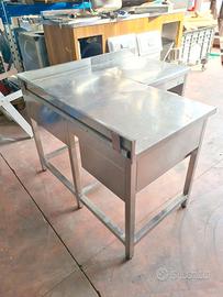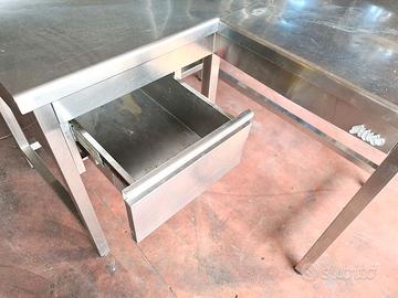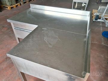 tavolo inox angolare con cassetto usato, si tratta di un tavolo angolare totalmente in acciaio inox dotato di alzatina e cassetto. adatto per ambienti come: cucine professionali, ristoranti, ospedali, etc.