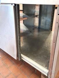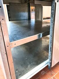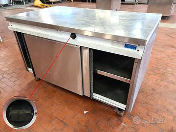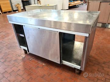 tavolo inox armadiato a isola usato, si tratta di un tavolo riscaldato, ma non sappiamo se funziona e lo vendiamo semplicemente come isola di preparazione piatti per ristorante. armadiato con doppio ripiano interno. dimensioni: 141X80cm h86cm