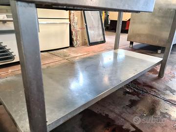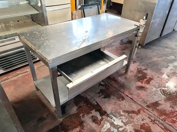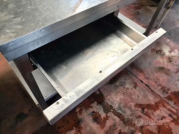 tavolo inox con apriscatole usato, si tratta di un tavolo di lavoro in acciaio inossidabile dotato di cassetto, ripiano inferiore e apriscatole utilizzato per l'apertura di: lattine, barattoli, latte, etc. se togli l'apriscatole il tavolo avrà dei fori.