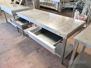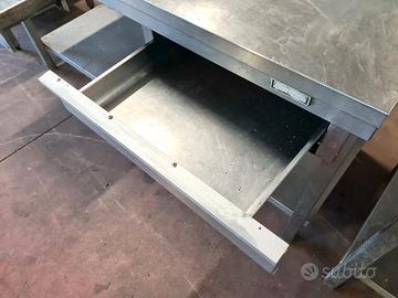 tavolo inox con cassetti e ripiano usato, si tratta di un tavolo da lavoro in acciaio inossidabile dotato di ripiano inferiore e due cassetti porta oggetti. un cassetto ha la finitura estetica staccata.