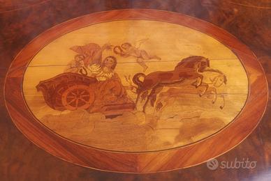 In noce massello con raffinate tarsie di legni vari, il piano presenta una straordinaria scena centrale ispirata al “Carro del Sole”, tratta dall’affresco “Aurora” del Guercino, circondata da medaglioni dedicati ai grandi maestri del Rinascimento (Leonardo, Michelangelo, Raffaello e Tiziano) e motivi vegetali a grottesche.