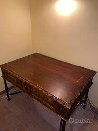 Tavolo intarziato antico stile studio notarile, di datazione primi anni 900. Con basamento in ferro battuto fatto a mano rimuovibile.