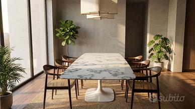 Tavolo IOTA – Design essenziale di Matteo Calonaci. Il tavolo IOTA nasce da un’ispirazione tipografica: il suo disegno richiama la lettera “I” maiuscola (Serif) dell’alfabeto greco, da cui prende il nome. Le forme morbide e strutturate diventano un elemento distintivo del design della base.La struttura è realizzata in fusione di alluminio e presenta una solida gamba centrale a sezione rettangolare, progettata per sostenere piani di diverse dimensioni.Estremamente versatile, IOTA si adatta a diversi contesti: tavolo da cucina, da salone, scrivania o tavolo da conferenza. Può essere realizzato con piani in legno massello, MDF, marmo o ceramica. Disponibile con colori e misure completamente personalizzabili. Il tavolo dell'annuncio ha la base verniciata in Rilsan biabnca ed il top a botte cm220x120 con il bordo smussato a scomparsa in marmo Arabescato spessore 2 cm . Il tavolo è numerato ed ha il certificato di autenticità firmato dal designer Designer : Matteo Calonaci Nato a Poggibonsi (SI) nel 1984, cresce nel cuore dell’Italia apprendendo le tecniche del prodotto industriale nel laboratorio di famiglia, grazie al nonno, imprenditore e designer nel settore dell’illuminazione oltre che pittore e scultore di fama. Si forma presso l’ISIA di Firenze, dove consegue la laurea specialistica in design del prodotto.Dopo gli studi avvia la propria attività collaborando con aziende nei settori della pelletteria, tecnologia e arredamento. Giovane promettente, il suo approccio progettuale unisce le conoscenze artigianali tradizionali alle moderne tecnologie produttive, dando vita a oggetti creativi con ottime basi costruttive e forte identità. Parole chiave: B&B Italia, Cassina, Flexform, Acerbis, Molteni, Knoll International, Tulip, Vitra, Artemide, Flos, De Padova, Zanotta, Arflex, Giorgetti, Boffi, Edra, Fornasetti, Minotti, Maxalto, Oluce, Baxter, Catellani & Smith, Poliform, Poltrona Frau, MDF Italia, ICF, Alivar, Moroso, Moooi, Ceccotti, Saporiti, Tecno, Poltronova