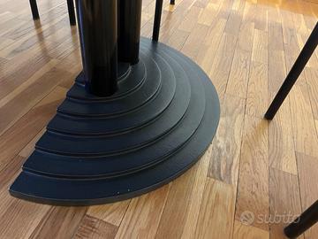 Tavolo prodotto da IVM degli anni 90. Caratterizzato da una struttura in metallo smaltato nero. La base presenta un design a gradoni a forma di semicerchio. Base in metallo.(acciaio o ghisa ) tutto nero con colonne portanti cilindriche, piano in legno smaltato nero.