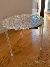 Il Kartell T-Table di Patricia Urquiola è un tavolino realizzato in PMMA trasparente con un piano decorato che ricorda un ricamo.