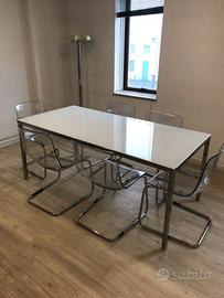 tavolo laminato acciaio con piano in vetro completo con 6 sedie plexiglass e acciaio, vendibili separatamente. misure: largh. cm 85 - lungh. cm 180 - h. cm 70