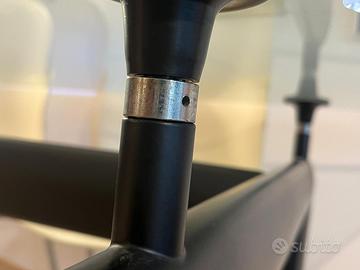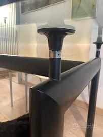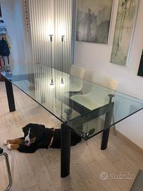 tavolo da pranzo LC6 di Le Corbusier, Pierre Jeanneret e Charlotte Perriand per Cassina, con base in acciaio verniciato nero opaco e piano in cristallo trasparente.