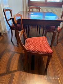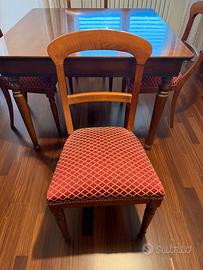 4 Sedie coordinate con schienale ergonomico in legno e seduta imbottita in tessuto damascato rosso/oro (come da foto), in ottime condizioni di conservazione.