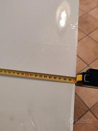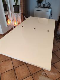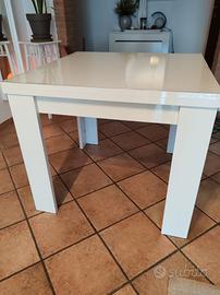 Tavolo con pochi segni di usura in generale. Parte superiore rivestita con pellicola bianca+trasparente poiché la vernice si è sollevata in alcuni punti. 90x90 bianco laccato. Chiusura a libro, diventa 180x90. Legno. Praticamente montato. Ritiro a mano