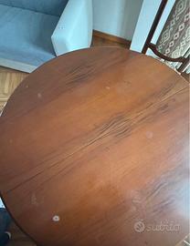 Vendo splendido tavolo rotondo d'epoca in pregiato legno massello color noce, caratterizzato da un'importante gamba centrale a colonnina finemente lavorata e quattro piedi a voluta intagliati.