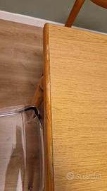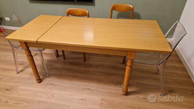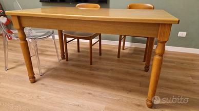 Vendo tavolo da pranzo in legno, in ottime condizioni strutturali e con normali segni d’uso sul bordo (visibili in foto). Il piano presenta una finitura lucida rovere chiaro