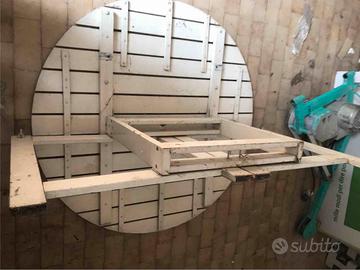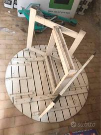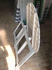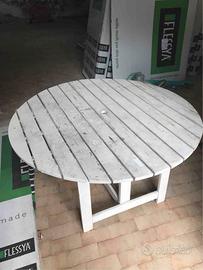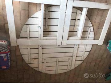 vendo robusto tavolo rotondo in legno verniciato bianco (solo da ripulire, non è rovinato!), da giardino / veranda / balcone. Predisposto un foro centrale per innesto di ombrellone (eventuale). Il tavolo è pieghevole (si apre si chiede facilmente) e misura 110 cm di diametro per una altezza di 65 cm. In regalo una sedia bianca abbinata (se voluta).