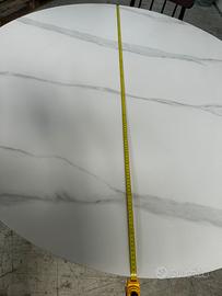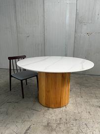 Tavolo dal design elegante e contemporaneo, con piano rotondo bianco effetto marmo e base in legno cannettato naturale.