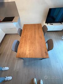 Vendo tavolo con struttura in metallo e top in legno massiccio dimensioni 90x160 h 76 con 4 sedie in polipropilene inpilabili. Tavolo molto robusto e bello di design.