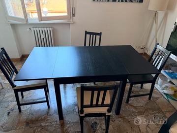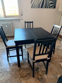 Vendo pratico e funzionale tavolo in legno Ikea allungabile, chiuso per 4 persone misura 90x90 aperto comode 6 persone 170x90 , con le sue 4 sedie coordinate, 2 con cuscino 2 senza cuscino.