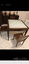 Tavolo legno massello wenge, resistente, legno pieno made in Italy, misure 90 x 90 cm, altezza 76 cm, ripiani in vetro opacizzato aperto diventa 180 cm, acquistato in un mobilificio a Roma, pagato oltre 1000 euro.