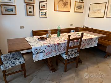 Tavolo allungabile 160/280 , completo di panca angolare modulare con contenitore sotto le sedute e tre sedie legno massello