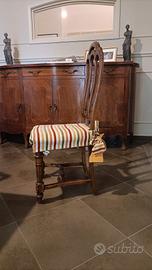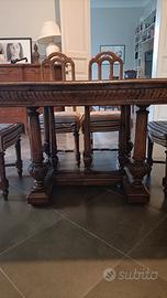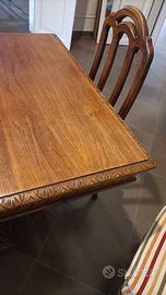 Tavolo da pranzo rettangolare 170*100 cm ,in legno massello ,finitura Noce medio, con piano decorato come da foto,completo di 6 sedie e cuscini .