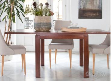Tavolo da pranzo quadrato allungabile in legno di colore teak raddoppia le sue dimensioni quando viene aperto.Passa da un tavolo di 90 cm a 180 cm, quattro posti chiuso, otto aperto. Colore teak .