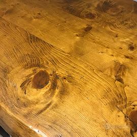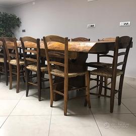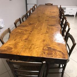 Tavolo di legno massiccio per interno o esterno se protetto dalla pioggia, pianale in un unico pezzo, fatto a mano da artigiano comprensivo di 16 seggiole impagliate sempre fatte a mano da maestro falegname.
