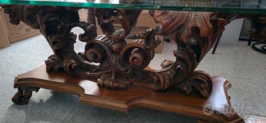 Il piano in vetro è sagomato con elementi decorativi dorati