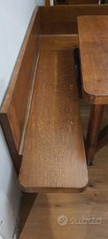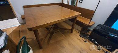 Tavolo fatto a mano da esperto artigiano in legno pregiato, dimensioni 130 x 130, ha segni di usura e necessita di un po' di manutenzione straordinaria, molto robusto, ha 2 ruote che lo rendono facilmente spostabile, è corredato anche di 2 panche apribili che possono fare da contenitore molto comode, molto bello, solo ritiro a mano