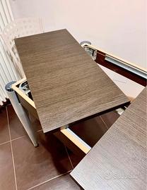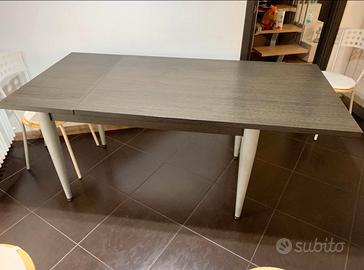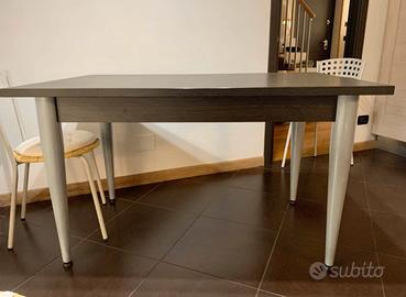 Vendo tavolo di legno rovere moro, spesso 3 cm, misure 130x80 cm, h 78 cm, allungabile 160 cm con prolunga posizionata sotto il piano, ideale per cucina e zona pranzo, gambe in acciaio opaco e belle robuste, con insieme 4 sedie con seduta in paglia.
