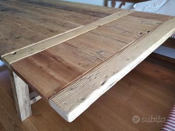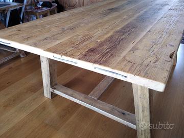 tavolo costruito in legno vecchio recuperato da solai o parancole da muratore leggermente levigate in modo che siano morbide al tatto mantenendo la pattina originale naturale che il tempo ha fatto come da richesta (anche tenendo la testa originale delle tavole con imperfezioni e qualche lama di ferro in testa) con misura lunghezza 210 larghezza 115 altezza 80 con le 4 gambe costruite con pattina in tutti i lati da circa 10 x 10 unite tra loro con traverso sottostante proporzionato e traverso di congiungimento tra unione delle 2 gambe dx e sx, fissato con traverso nascosto e fissato sotto al piano con spessore finito circa 4 cm, nella parte centrale troveremo spazio 2 cassetti indipendenti che scorreranno su guide in legno e nascosto tutta (la scatola) e fissata direttamente sotto al piano. Le 2 allunghe 1 a dx e 1 a sx con misura lungh. 45 cm circa con 3 supporti a baionetta in ferro essendo ben largo, le gambe saranno inclinate solo da un lato verso il (centro di loro stesse) le allunghe saranno con venature sul lato del 45 con applicato alle estremità legno trasversale in modo da mantenerle dritte e non flessibili, unione delle tavole con anima interna nascosta. Sotto al piano incassati ferri a T in modo che non si incurvi nel tempo. Il tavolo sarà smontabile. Tappi in gomma parte sotto per non rovinare il pavimento. Finitura effetto grezzo naturale trasparente impermeabile con questo prodotto non altera il colore e lo protegge da acqua o altro. il tavolo è stato costruito su commissione ed esigenze del cliente, non è disponibile a magazzino ma essendo i diretti produttori falegnami possiamo riprodurlo uguale o in base alle proprie esigenze. per domande o dubbi contattateci P.S. disponibili a dare suggerimenti o chiarimenti in merito, per noi conta dare vita al vostro sogno DIRETTAMENTE DAL PRODUTTORE ASTENERSI RIVENDITORI O COMMERCIANTI