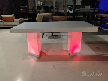 Una delle caratteristiche distintive del nostro tavolo è la base in plexiglass, che conferisce un tocco di modernità e leggerezza. Le gambe sono dotate di LED RGB, che possono essere personalizzati per adattarsi all’atmosfera desiderata. Che si tratti di una cena romantica o di una festa con amici, l’illuminazione può essere regolata per creare l’ambiente perfetto. Grazie a questa innovativa integrazione, il tavolo diventa non solo un elemento funzionale, ma anche un punto focale di design nel vostro spazio.
