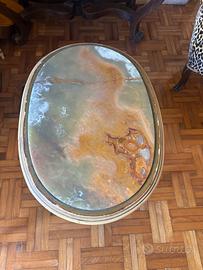 Questo tavolino vintage in stile Luigi XVI presenta una struttura in legno dorato e un piano in marmo intarsiato. Il pezzo è caratterizzato da gambe tornite e affusolate e da una forma ovale, tipica del design di mobili francesi del XIX secolo.