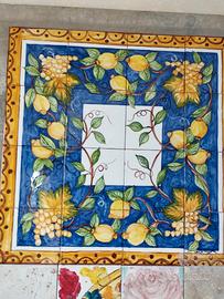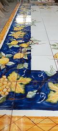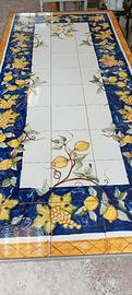 Tavolo in ferro lavorato con piano di maiolica e maioliche decorato a mano. Mattonelle con decorazioni artigianali. Lavorazione tipica vietrese. Possibilità di realizzare solo il piano, qualsiasi misura preferite, con decori personalizzati. Posso spedire o ritiro in provincia di napoli. Il Prezzo varia in base alle dimensioni e al decoro. Inviate un messaggio pee conoscere i costi.