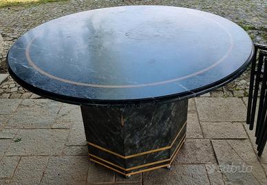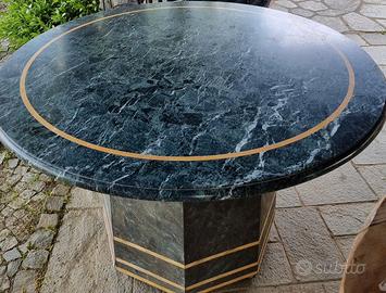 Splendido tavolo circolare da pranzo o rappresentanza, caratterizzato da un’estetica lussuosa e imponente, tipica della produzione italiana d'alta gamma degli anni '70 e '80. Caratteristiche Principali: Materiali: Realizzato interamente in pregiato Marmo Verde (varietà Verde Alpi/Guatemala) con un elegante intarsio circolare in Marmo Giallo Siena. Design: Il piano poggia su un robusto basamento ottagonale coordinato, impreziosito da doppie fasce dorate alla base che donano un tocco Hollywood Regency/Post-moderno. Praticità: Il basamento è dotato di ruote a scomparsa per facilitare il posizionamento e lo spostamento di un pezzo dal peso importante. Dimensioni: 136 cm (Diametro) x 84 cm (Altezza). Stato di Conservazione: Il tavolo è strutturalmente integro e conserva tutto il suo fascino originale. Essendo un pezzo vintage autentico, presenta alcuni segni del tempo e dell'usura : Leggera opacizzazione superficiale del piano e piccoli graffi da utilizzo. Piccole mancanze di materiale e sottili fessurazioni in corrispondenza delle giunzioni dell'intarsio giallo. Nota: Questi difetti sono facilmente ripristinabili con una lucidatura professionale del marmo, che riporterebbe il pezzo alle condizioni originali "a specchio". Ritiro: A carico dell'acquirente (dato il peso del marmo, si consiglia il ritiro con mezzo idoneo e almeno due/tre persone per il carico).