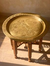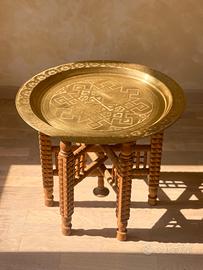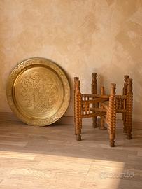 Aggiungi un tocco di fascino esotico alla tua casa con questo elegante tavolino marocchino. Realizzato artigianalmente, il tavolo presenta un ampio vassoio rotondo in ottone inciso a mano, decorato con raffinati motivi geometrici tradizionali. La base in legno scolpito è riccamente lavorata con motivi tridimensionali e incastri a griglia, tipici della maestria artigianale nordafricana.