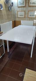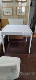 Tavolo da cucina in ottime condizioni. Formato quadrato 90x90, raddoppiabile da aperto a 180x90. Piano in legno, laccato. Struttura e gambe in acciaio bianco. No spedizione, ritiro a carico acquirente.