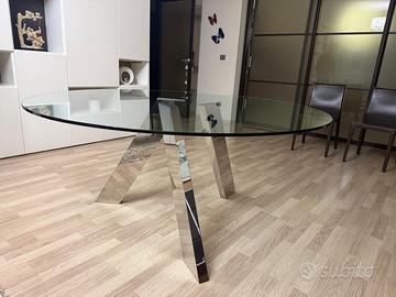 Tavolo modello Fix Former design Pinuccio Borgonovo, tondo diametro 160 h. 74. Piano cristallo temperato extra light, gambe metallo finitura piombo