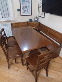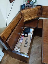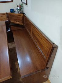 Panca ad L in legno massello color noce - arte povera, con contenitori nelle sedute. misure 190 × 130 profondità 49.