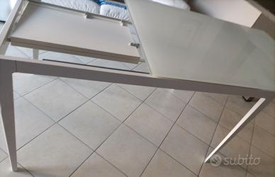 Tavolo bianco (130 cm x 85) con top in vetro temperato e struttura in acciaio, allungabile da un lato.