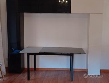TAVOLO MODERNO con piano in vetro lucido nero. Chiuso misura cm 120 x 80 e ha prolunga di 50 cm color argento. Non ha bozzature sulle gambe e il piano in vetro è integro, solo con minimi graffi poco visibili. Ritiro a carico dell'acquirente. 100 euro non trattabili.