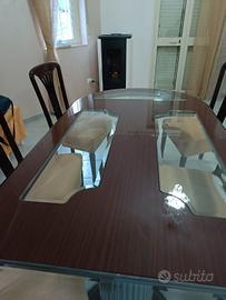 tavolo mogano con sedie, in perfette condizioni ad eccezione di una piccola rottura del vetro del tavolo.