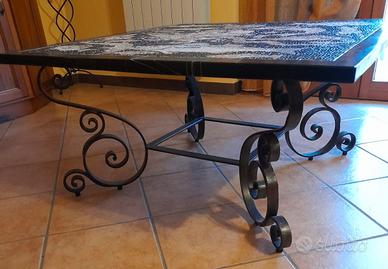 Dimensioni: 1m x 1m Tavolo in pietra con lavorazione artigianale in mosaico. Base lavorata in ferro battuto. Disponibile per altre foto e/o visione dal vivo.