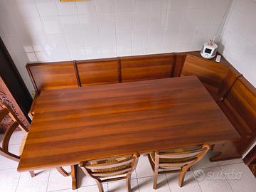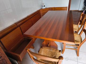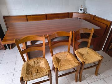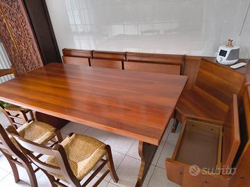 Tavolo 180x90 altezza 80, spessore 4 cm Cassapanca. 255x120 La parte lunga scomponibile in tre pezzi quindi al bisogno accorciabile o allungabile aggiungendo il pezzo della parte corta. Delle tre sedie una è da impagliare perché rovinata, le altre sono messe bene, molto comode. Eventuale aiuto per smontaggio e trasporto al piano stradale. Legno massello e impiallacciato noce. Non spedisco A richiesta altre foto. Ponte San Nicolò (PD) 200 euro