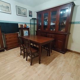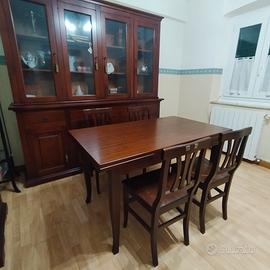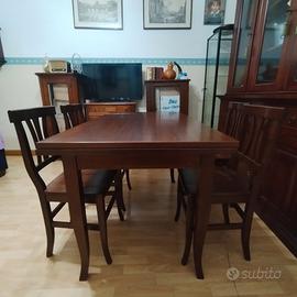 Vendo tavolo in Noce massello acquistato da mobilificio artigiano in Veneto, dimensioni h cm 82 larghezza cm 80 lunghezza cm 140, estensibile di altri cm 40 per lato con prolunghe. Perfetto come nuovo. compreso di n. 4 sedie.