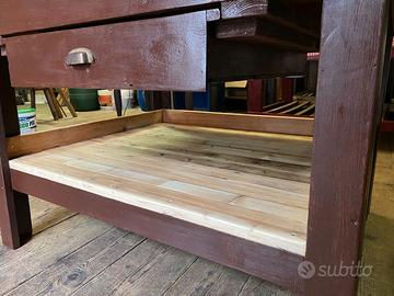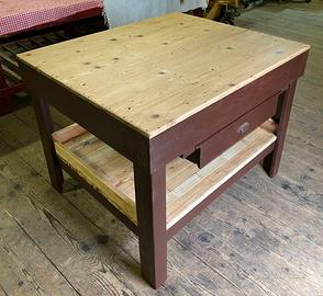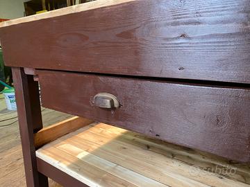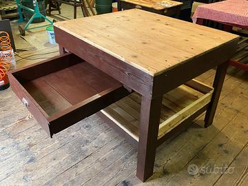 Tavolo in legno ottimo per arredare un negozio o per eseguire lavori, strutturalmente molto solido con grande cassetto e ripiano inferiore. La verniciatura è stata eseguita con smalto all'acqua Boero color cuoio 720, mentre i piani di lavoro sono trattati con finitura trasparente per legno. Si tratta di un tavolo nuovo, realizzato artigianalmente con legno di seconda mano. Misure: 120x100x92 cm Ritiro presso Turbigo Stefano