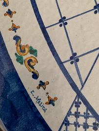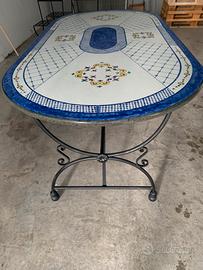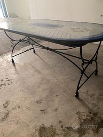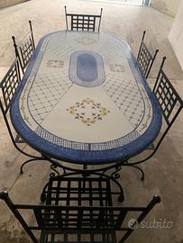 Stupendo tavolo in pietra lavica nuovo con sei sedie e preziosa base in ferro battuto. Misura cm. 200 x100 spessore 4.Realizzato e dipinto a mano a Messina dai maestri artigiani di Melita. Prezzo solo 1100 euro. Tel 3348085766 x visione a Sacile