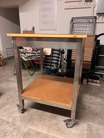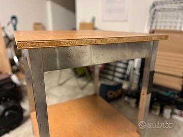 Vendo come da foto tavolo/carrello con ruote bloccabili singolarmente. Struttura in acciaio e ripiani in legno. Dimensione ripiano superiore 70x70 spessore 2,5 cm. Altezza da terra comprensivo di ruote 93 cm. Distanza tra ripiano sotto e struttura in acciaio orizzontale superiore 53 cm. Distanza tra i ripiani 61 cm