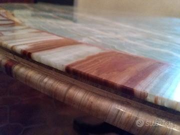 Vendo tavolo in marmo onice del Pakistan, anni 60, laboratorio di Carrara, prestigioso ed unico nel genere, forma rotonda, nessun difetto, diametro cm 120 , spessore cm 2 , con base di supporto a quattro piedi in legno di palissandro è piedi di ottone.