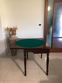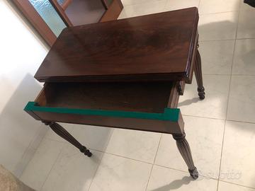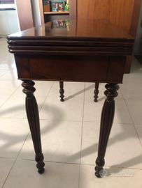 tavolo da gioco a consolle, in stile Biedermeier o del XIX secolo, realizzato in legno di mogano con un piano apribile a libro rivestito in panno verde. Materiale: Legno di mogano con finiture raffinate. Funzionalità: Piano pieghevole che trasforma il tavolo da una console decorativa a un tavolo da gioco funzionale. Caratterizzato da linee eleganti gambe intagliate o tornite, tipico dell'arredamento d'epoca del 1800.