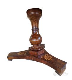 Struttura in noce massello con raffinate tarsie di legni vari a motivo radiale sul piano, impreziosito da filetature decorative e disegno centrale vegetale. Base con sostegno centrale e piedi sagomati, tipologia tipica della produzione della bottega.