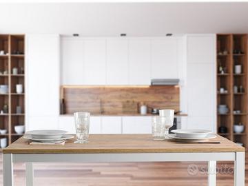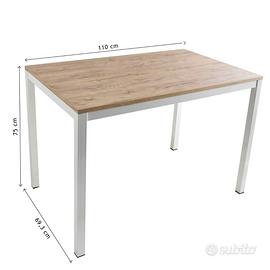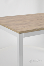 Tavolo nuovo con robusta struttura in acciaio verniciato bianco e piano in nobilitato color quercia rustica. Il prodotto è realizzato artigianalmente, richiede un semplice assemblaggio. Le misure totali sono: 110x 69,3x75 cm.